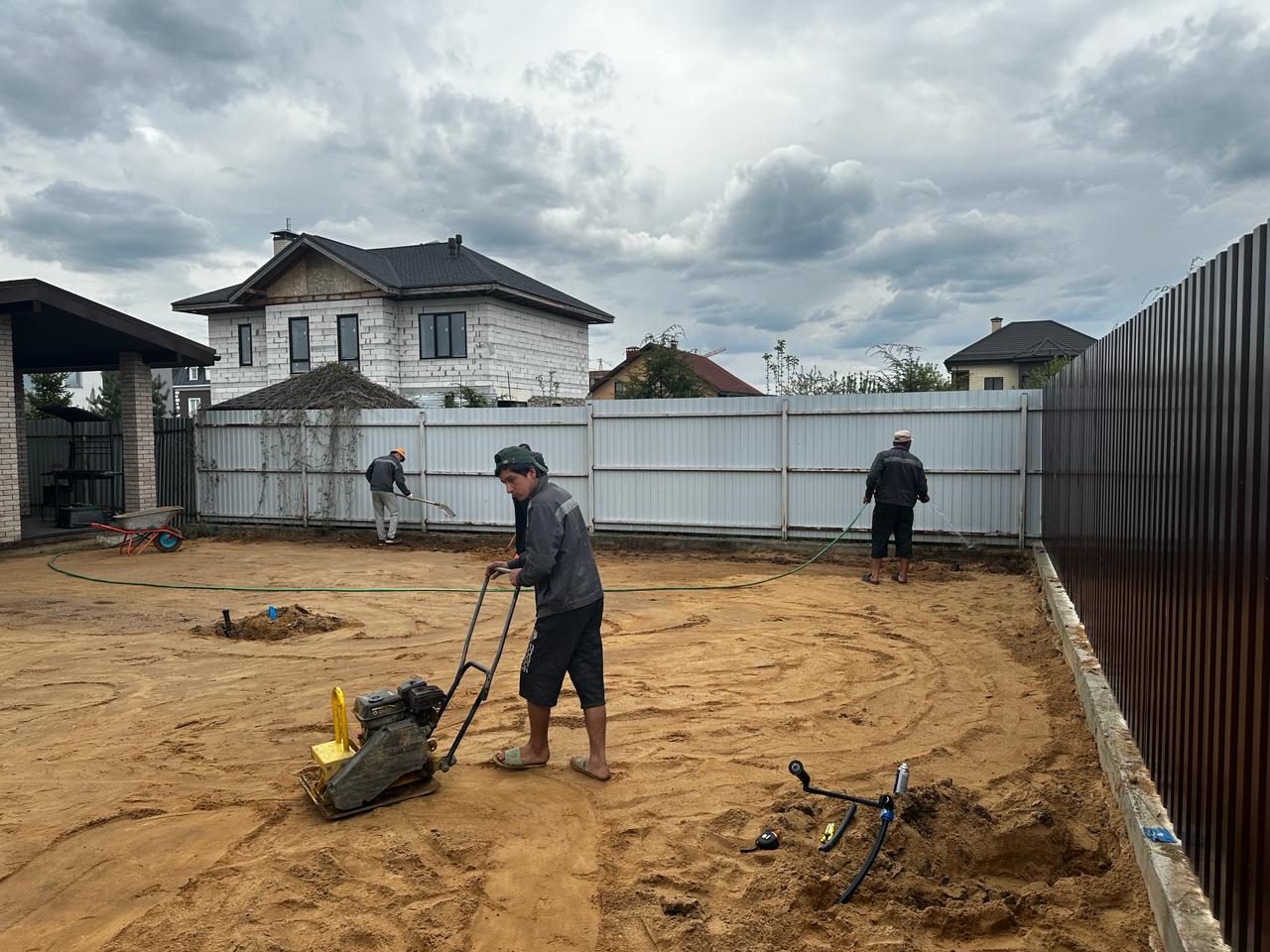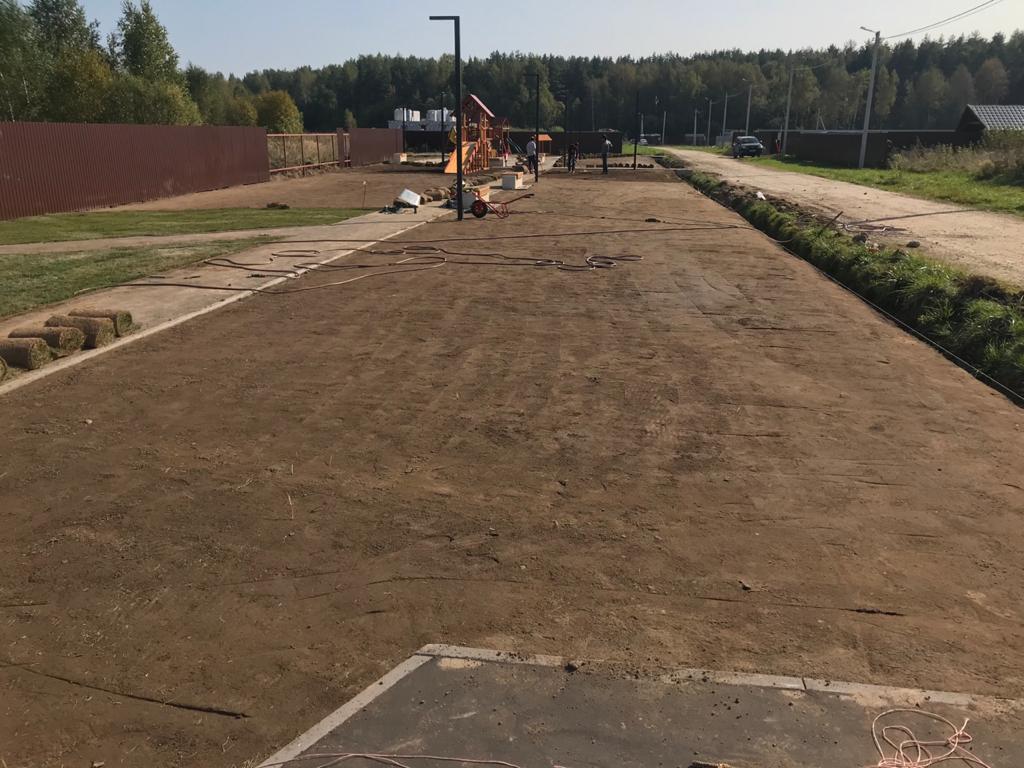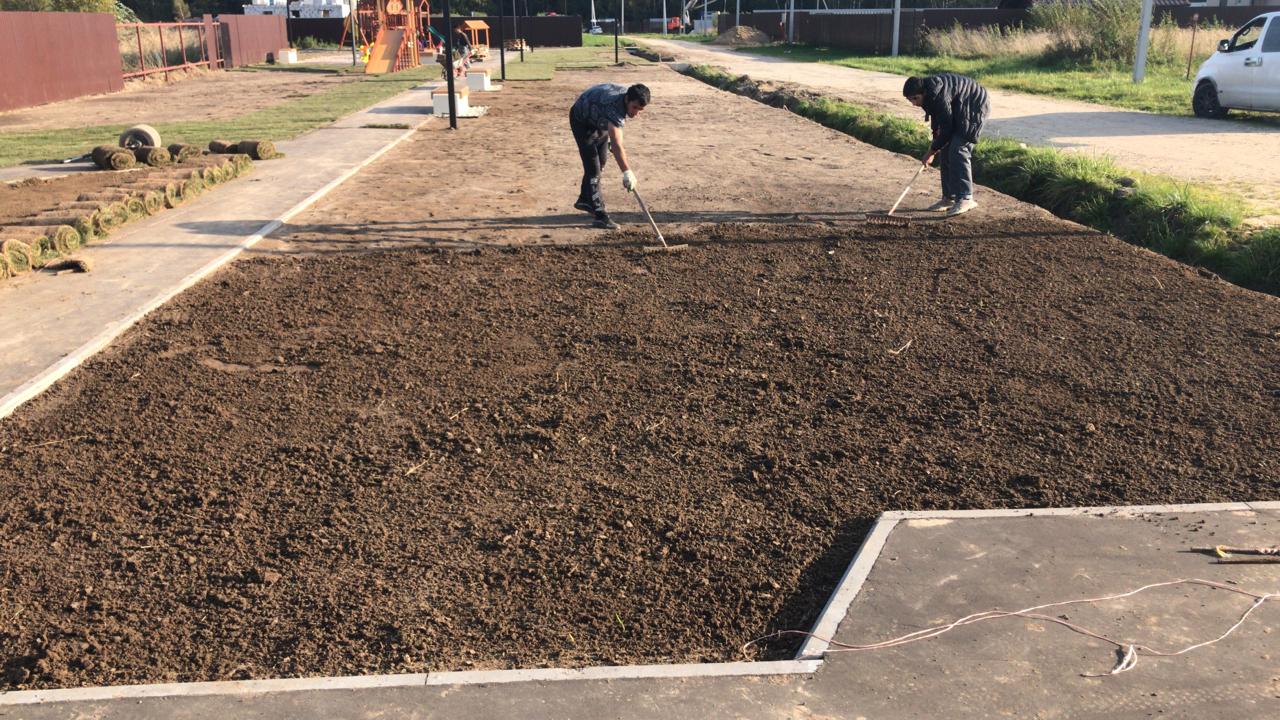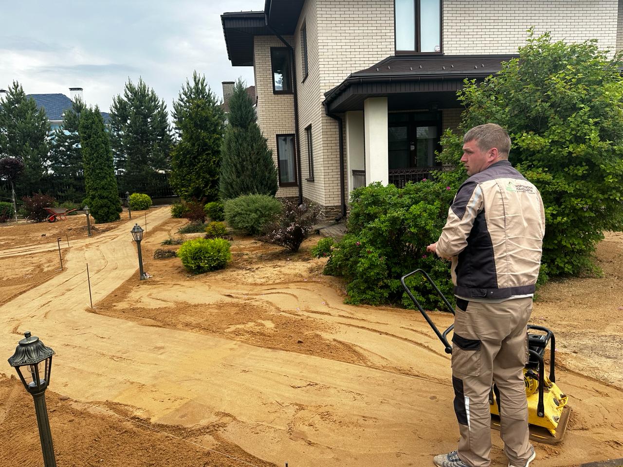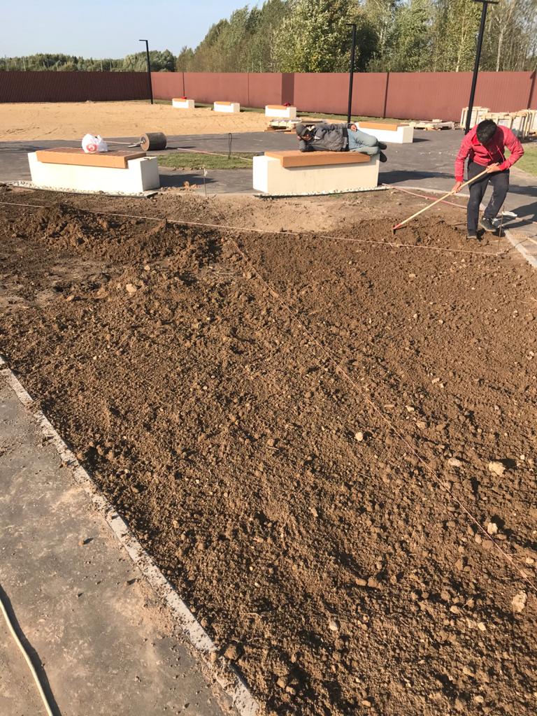 Планировка: После завоза грунта/песка проводится планировка. Это выравнивание поверхности участка, чтобы создать ровное основание для укладки рулонного газона. Важно добиться небольшого уклона для стока воды. - Финишная обработка: Трамбовка